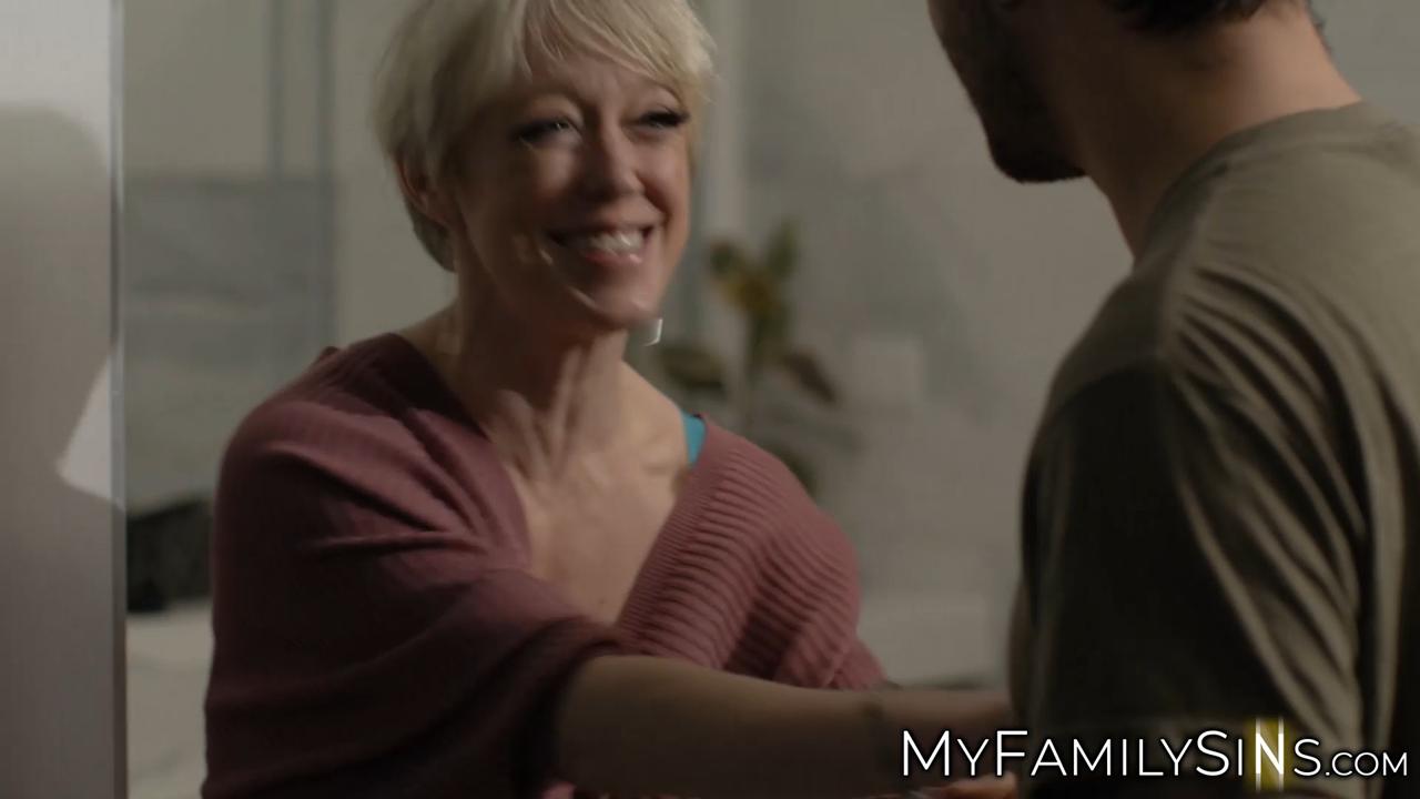 Blonde MILF Dee Williams is hesitant but gives in to her stepson's advances. She deepthroats his cock before getting fucked in missionary position. He covers her face in cum after a satisfying doggystyle session.