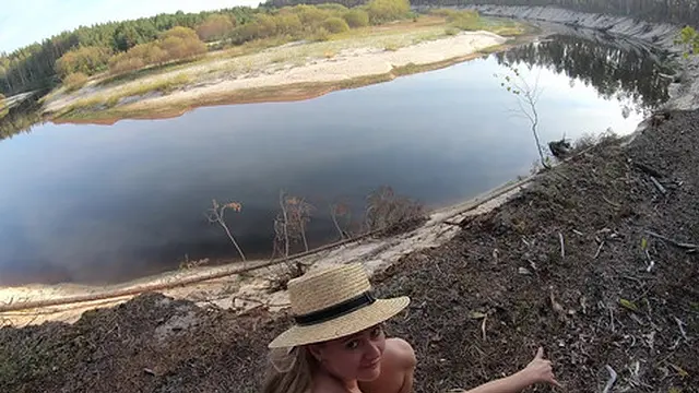 Girl masturbates on the bank of a beautiful river