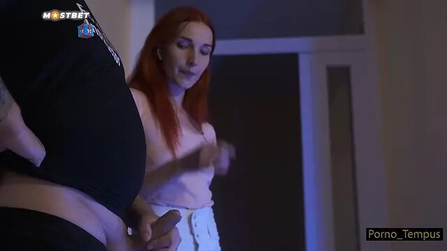 A cheating Russian housewife with fiery red hair gets caught in the act. She sucks her stepson's dick in a public place, moaning dirty talk as she pleases herself. He cums all over her face, and she eagerly laps it up.