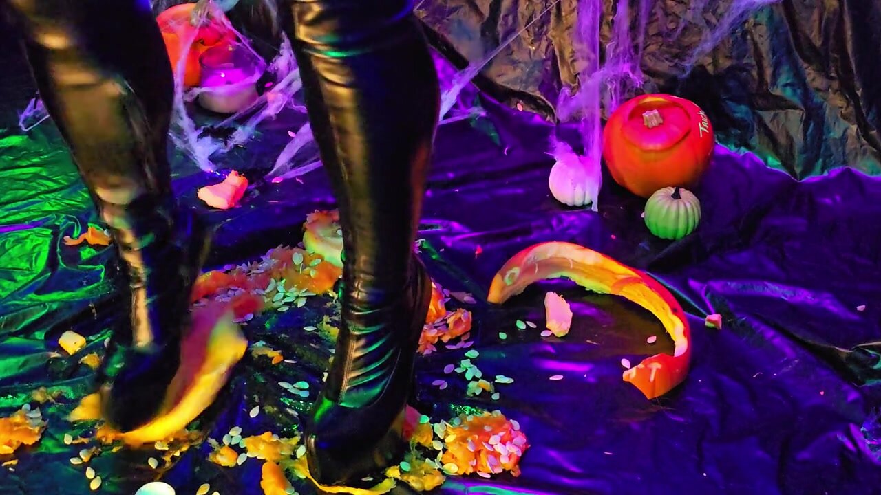 She wears a latex suit and high heels to crush and stomp on the pumpkin Her powerful boots leave imprints as she takes control over the situation No mercy is given as she makes sure every step leaves a mark